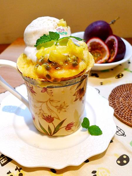 在蛋糕上頭加上一顆香草冰淇淋,撒放些許鳳梨丁、百香果,豪華升級!!