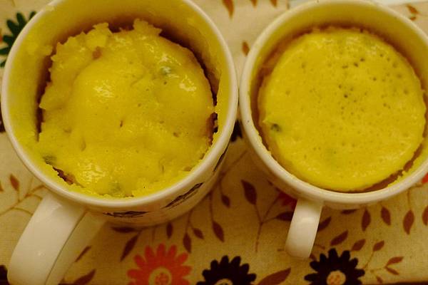 建議杯子裝7~8分滿,預留蛋糕在微波爐裡膨起來的高度